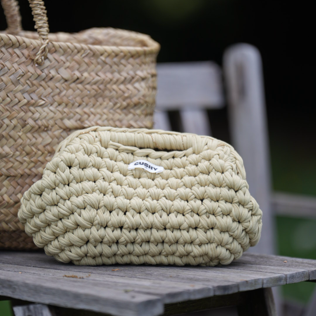 Chaque sac est réalisé à la main avec amour à partir de fil de tissu 100% recyclé de grande qualité provenant d'Europe. Ils sont conçus avec du fil issus du recyclage textile qui allie qualité et respect de l'environnement. Ajoutez une touche d’authenticité et de douceur à votre garde-robe avec nos accessoires crochetés à la main.