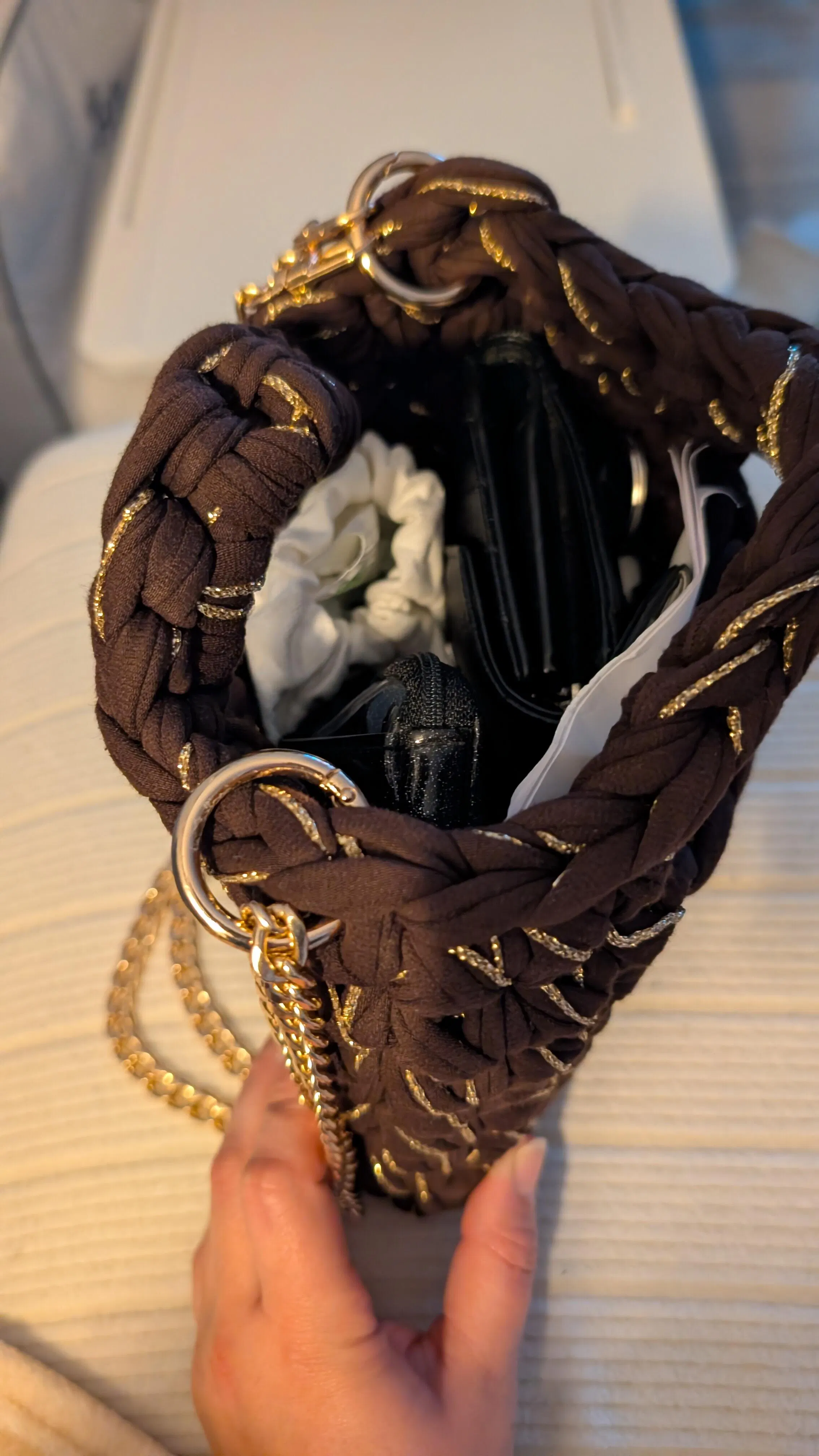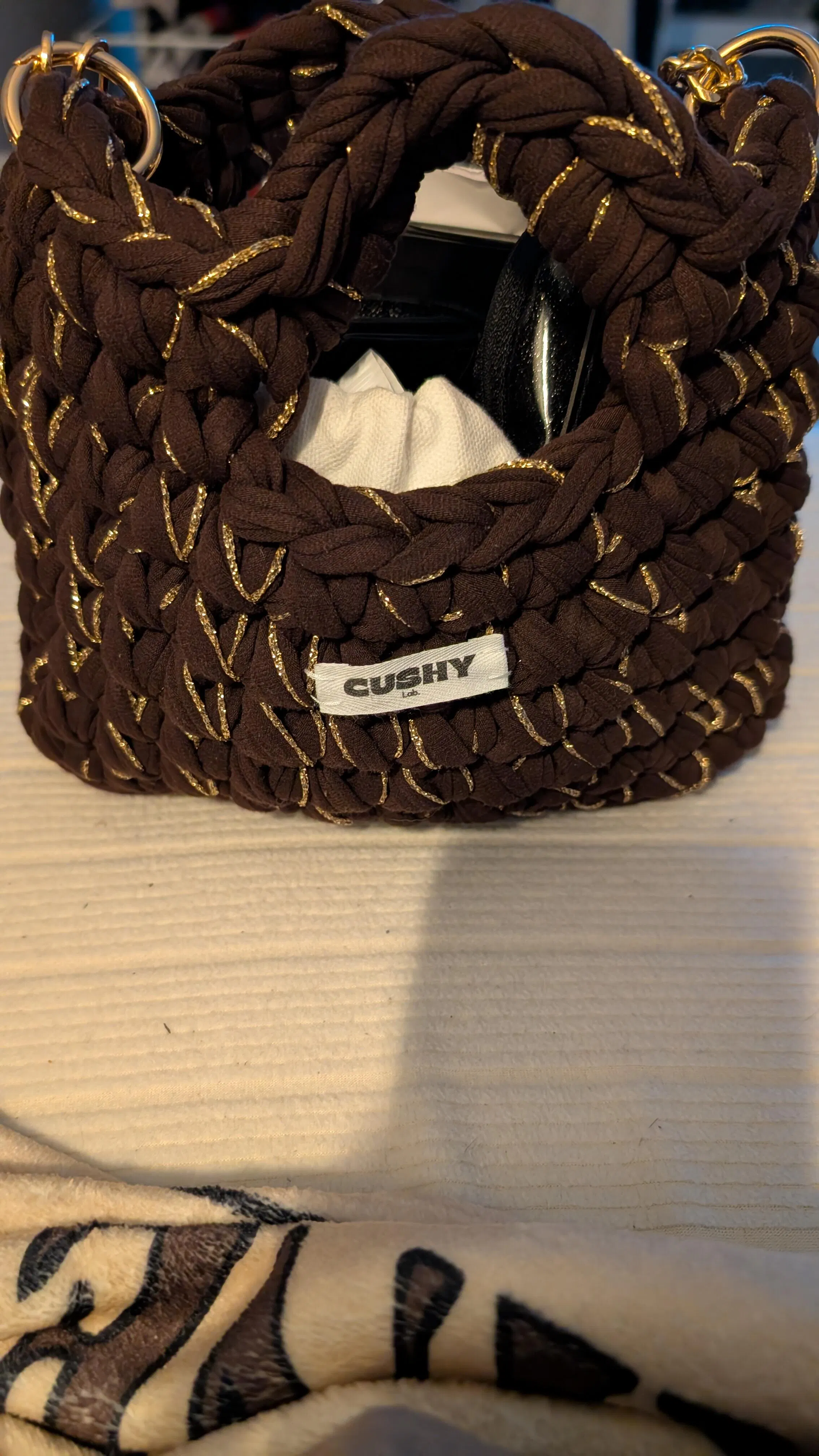 Chaque sac est réalisé à la main avec amour à partir de fil de tissu 100% recyclé de grande qualité provenant d'Europe. Ils sont conçus avec du fil issus du recyclage textile qui allie qualité et respect de l'environnement. Ajoutez une touche d’authenticité et de douceur à votre garde-robe avec nos accessoires crochetés à la main.